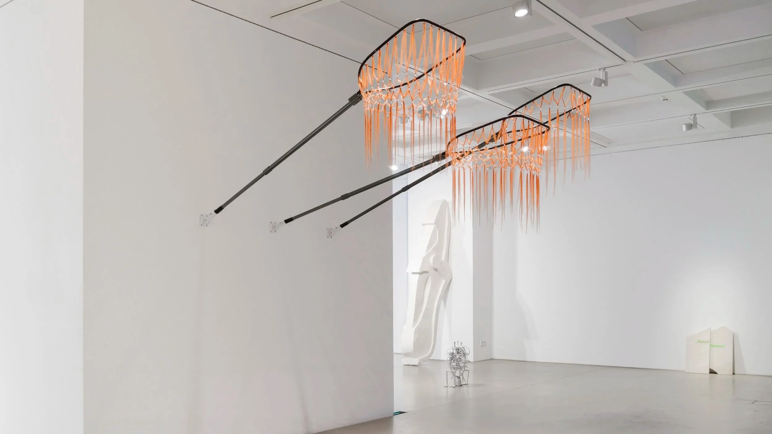 Real hair extensions (dyed red), rubber, aluminum, metal, each 250 × 40 cm, 2024